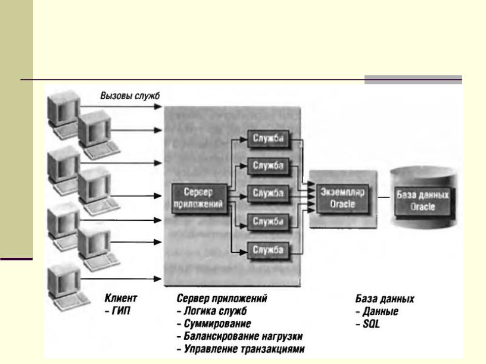 Суммирование – серверы приложений поддерживают пул разделяемых служб. Клиент вызывает службу, которая связывается с сервером базы данных.