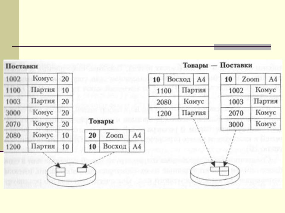 Физическая реализация: в начале страницы (блока) хранится запись из таблицы, для которой КК является первичным (уникальным), а вслед за ней располагаются записи из другой таблицы (таблиц), имеющие те же значения КК.
