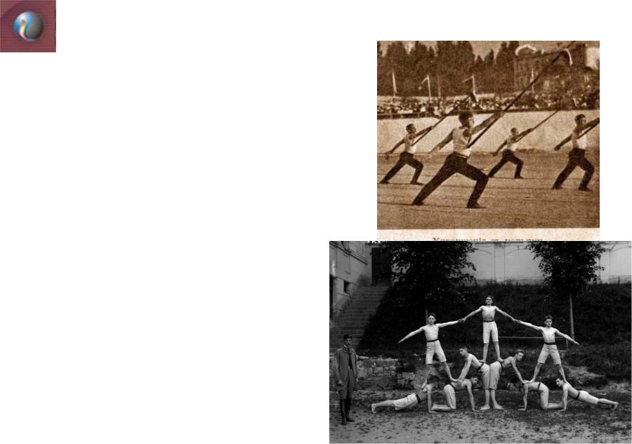 •Толчком послужили национальноосвободительные движения и переход к массовой армии, поэтому подготовку резервов для армии переносят на период обучения в школе. Возникает сокольская гимнастика (Чехословакия), немецкая гимнастика, шведская гимнастика. На рис. показательное выступление по сокольской гимнастике.
