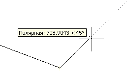 Полярне відстежування — це процес відстежування фіксованого напряму від поточної точки прив'язки. Напрями відстежуються також в відносних полярних координатах, при цьому видається підказка про те, який напрям відстежується (мал. 2.7). При знаходженні графічного курсора в точці прив'язки, через деякий час з'являється маленький жовтий хрестик, що відзначає початок процесу полярного відстежування.