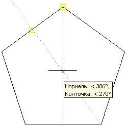 Розглянемо ще один приклад використовування всіх вищеперелічених методів. На малюнку 2.10 показано, як можна графічно знайти центр п'ятикутника. Використовуються три прив'язки: до середини, нормаль і до кінцевої точки. Спочатку знаходиться середина однієї з сторін, потім з цієї точки відстежується перпендикулярний напрям («нормаль: < 306°»). Далі знаходиться вершина і відстежується напрям вертикально вниз («Конточка: < 270°»). В місці перетину обох відстежувань знаходиться центр п'ятикутника.