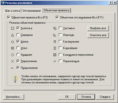 В процесі креслення об'єктні прив'язки включаються натисненням на відповідну кнопку, причому включаються лише ті, які відзначені галочками в діалозі настройок, показаному на мал. 2.6. Всього існує 13 видів об'єктних прив'язок. Найбільш часто що використовуються з них є: «Конточка», «Середина», «Центр», «Пересечение», «Продолжение», «Нормаль», «Касательная».
