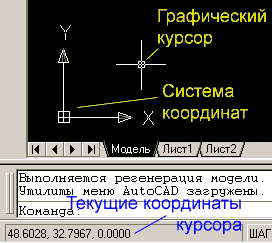 В AutoCAD, в основному, застосовуються декартові координати. Поточні координати курсору відображаються в лівому нижньому кутку екрану в рядку стану (див. мал. 2.1)