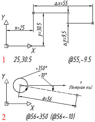 Завдання координат точки може бути здійснено двома способами: в явному виді (X,Y) відносно поточної ПСК або відносно координат попередньої точки (@?X,?Y). Під поняттям «попередня точка» маються на увазі координати останньої вказаної точки. Наприклад, при побудові лінії, якщо користувач вказав початкову точку, то її координати вважаються «попередніми».