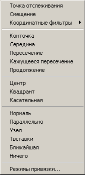 Зверніть увагу, що якщо в режимі введення координат клацнути правою кнопкою миші з натиснутим «Shift», то в контекстному меню (мал. 2.11), що з'явилося, будуть доступні команди тимчасових точок прив'язки (діючих лише усередині команди). Крім того, є можливість використовувати функції «Точка отслеживания» і «Смещение», які допомагають позбутися необхідності побудови допоміжних ліній.