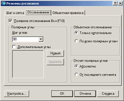 Включення/ виключення режиму полярного відстежування проводиться натисненням на кнопку № 4 «ОТС-ПОЛЯР» (див. мал. 2.5) або відповідну функціональну клавішу. Вікно настройок цього режиму (доступно з контекстного меню) представлено на мал. 2.8. Відлік полярного кута починається проти руху годинникової стрілки від горизонтальної осі, направленої вправо.