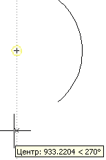 Відстежування об'єктних прив'язок — це метод, що є комбінацією об'єктних прив'язок і полярних відстежувань. Включається/ вимикається він натисненням на кнопку «ОТС-ОБ'ЄКТ» (№ 6 на мал. 2.5) або на клавіатурі. На мал. 2.9 показаний випадок, коли від центру побудованої дуги відстежується вертикальний напрям. При наближенні курсора до перетину цього напряму з іншим існуючим об'єктом спрацює прив'язка «Перетин».
