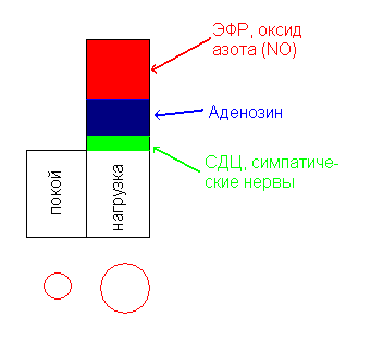 Нервные и гуморальные факторы вызывают расслабление коронарных артерий. В условиях нагрузки возбуждается СДЦ, усиливается влияние симпатических нервов на бета-1 и бета-2 адренорецепторы в мембранах миоцитов коронарных артерий, и, поскольку плотность адренорецепторов в мембранах невелика, происходит незначительное расширение коронарных артерий. Основные коронарные вазодилататоры – гуморальные факторы аденозин и эндотелиальный фактор расслабления (ЭФР) оксид азота.