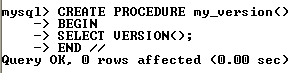 При работе с хранимыми процедурами символ точки с запятой в конце запроса воспринимается консольным клиентом как сигнал к отправке запроса на сервер. Поэтому следует переопределить разделитель запросов – например, вместо точки с запятой использовать последовательность // :
