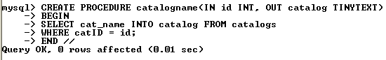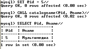Создадим хранимую процедуру catalogname(), которая будет возвращать по первичному ключу catID название каталога cat_name. Для этого потребуется определить параметр id с атрибутом in, и catalog с атрибутом OUT.