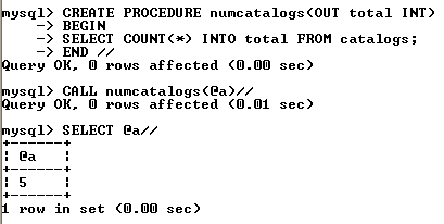 Хранимая процедура numcatalogs() имеет один целочисленный параметр total, в котором сохраняется число записей в таблице catalogs. Осуществляется это при помощи оператора select ... into ... from. В качестве параметра функции numcatalogs() передается пользовательская переменная @а.
