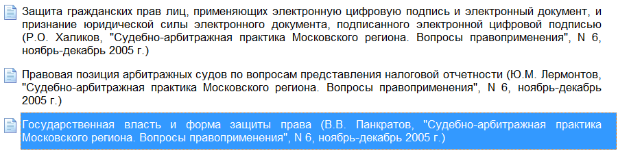 Используя список по источнику опубликования, найдите журнал «Судебно-арбитражная практика Московского региона. Вопросы правоприменения» № 6 за 2005 год. В этом номере журнала найдите статью «Государственная власть и форма защиты права» и укажите ее автора.