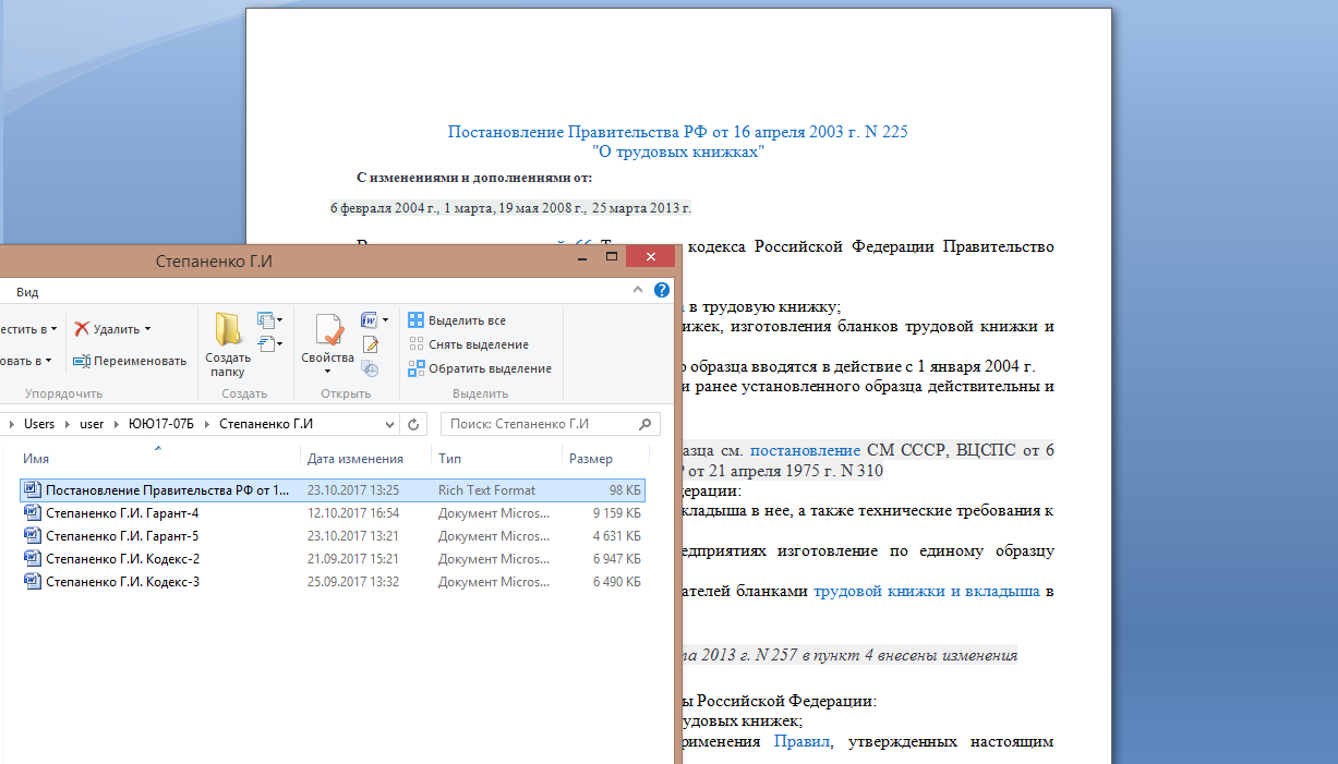 Найдите постановление Правительства РФ от 16 апреля 2003 г. № 225 «О трудовых книжках» с использованием интернет-версии системы ГАРАНТ. С какой даты вводятся в действие трудовые книжки нового образца? Перенесите в MS Word текст документа и сохраните его своей папке. Процесс сохранения файла проиллюстрируйте скриншотом. Ответ: с 1 января 2004 г.