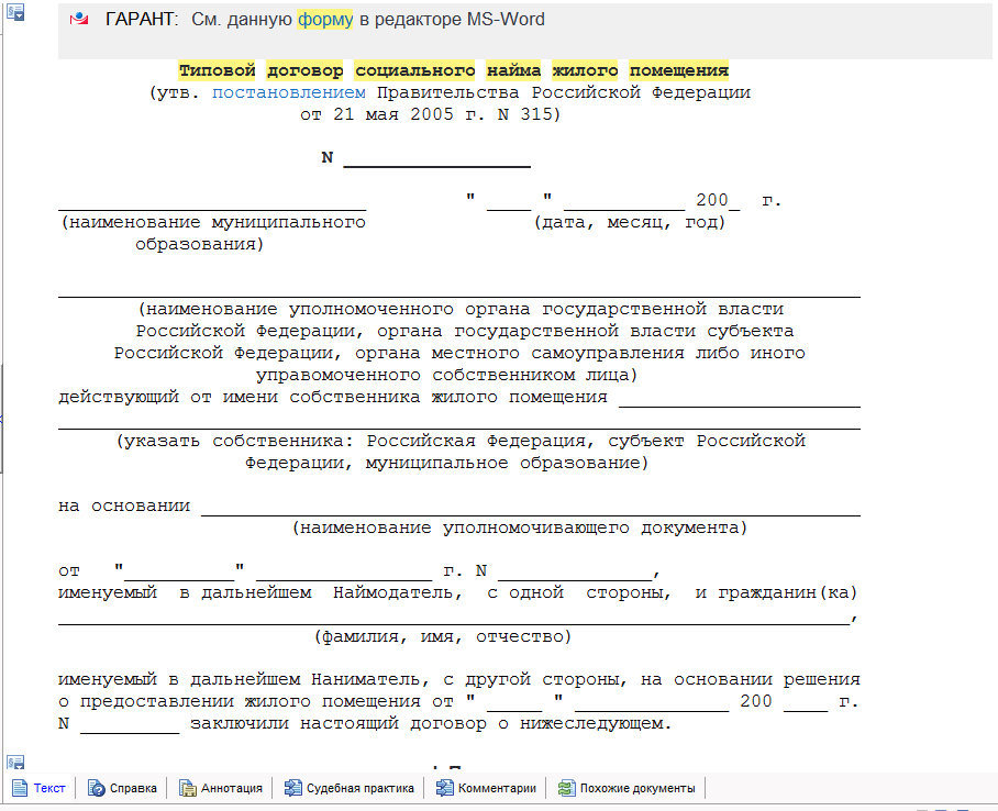 Найдите форму Типового договора социального найма жилого помещения, утвержденную постановлением Правительства РФ от 21 мая 2005 г. № 315.