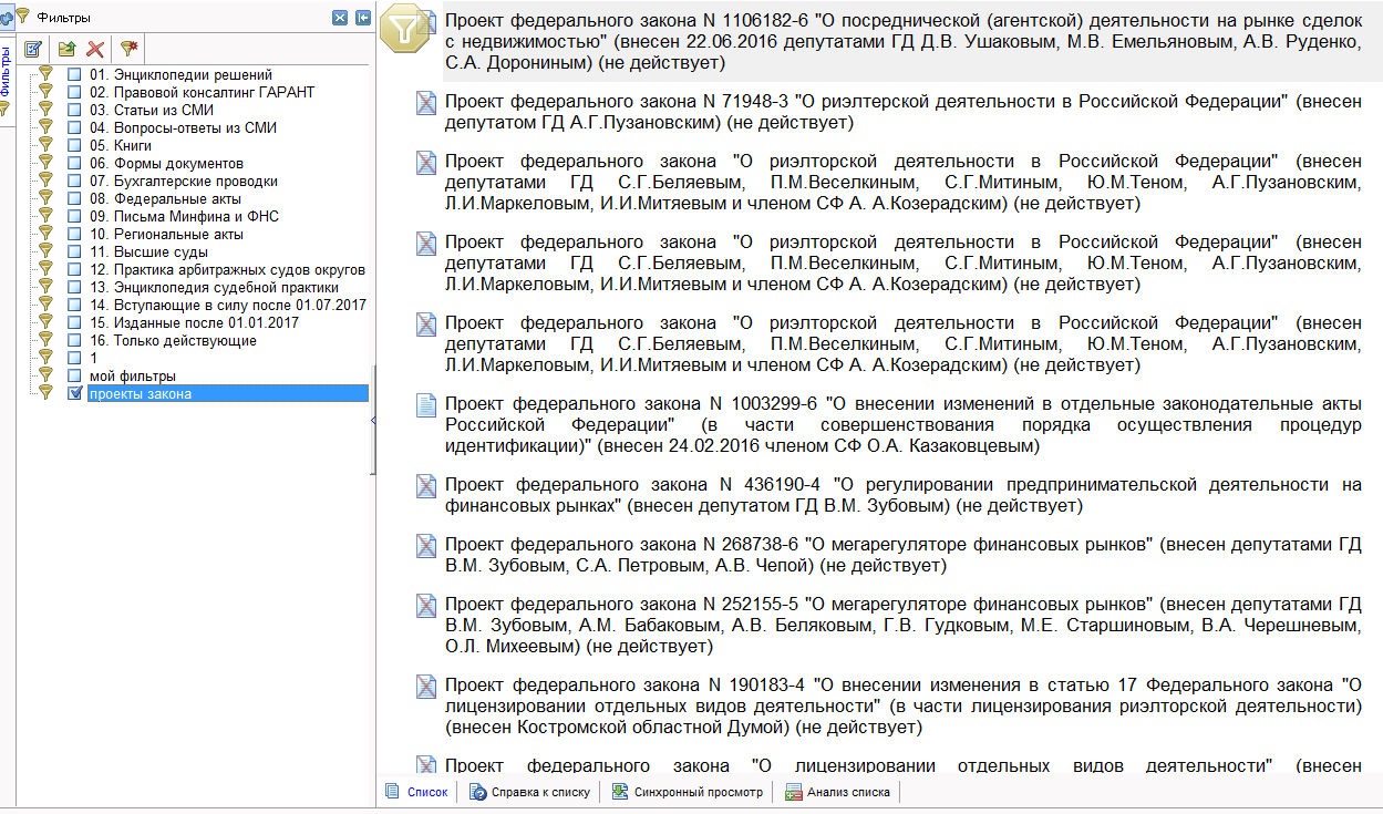 Постройте список документов о риэлтерской деятельности, воспользовавшись Базовым поиском. Примените фильтр Проекты законов. Укажите количество документов в списке. Сохраните полученный список в папку с именем «Проекты, риэлтерская деятельность».