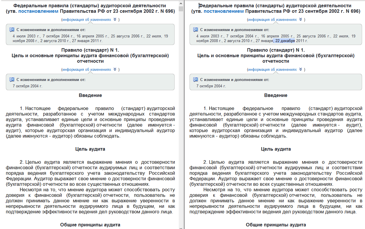 Документ Федеральные правила (стандарты) аудиторской деятельности (утвержденные постановлением Правительства РФ от 23 сентября 2002 г. № 696) имеет несколько редакций. Сколько их? Какая редакция (от какой даты) действовала 30 апреля 2005 года? Сравните две последние редакции.
