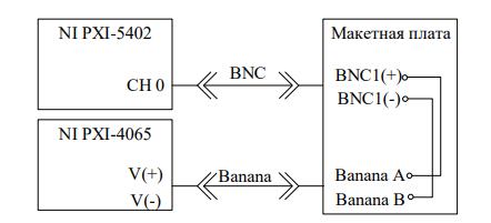 Для измерения постоянного напряжения соберем следующую схему с помощью кабелей BNC-BNC, Banana-Banana, перемычек и макетной платы NI