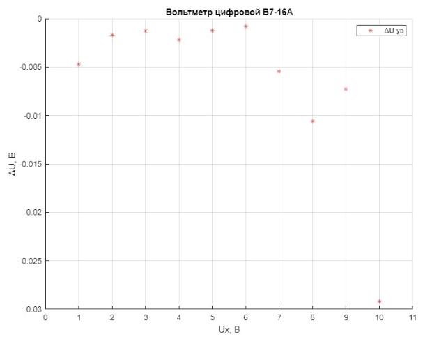 Выставим последовательно максимально приближенные целые значения на выбранном пределе измерения (для цифрового вольтметра) (от 1 до 10 В). Для каждой поверяемой отметки определим действительное значение измеряемой величины по образцовому прибору.
