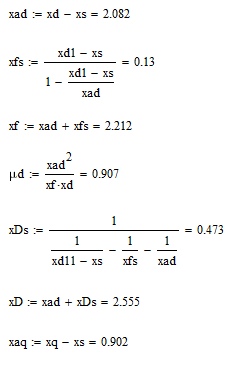 Упрощенная система уравнений судового синхронного генератора для случая, когда пренебрегаем апериодическими составляющими в статоре, принимаем активное сопротивление статора равным нулю, а скорость вращения первичного двигателя считается неизменной и равной синхронной скорости машины.
