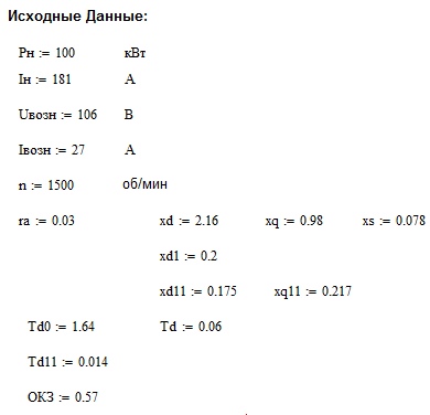 Расчет численных величин коэффициентов связи и постоянных времени полной системы уравнений судового синхронного генератора. Исходные данные представлены ниже: