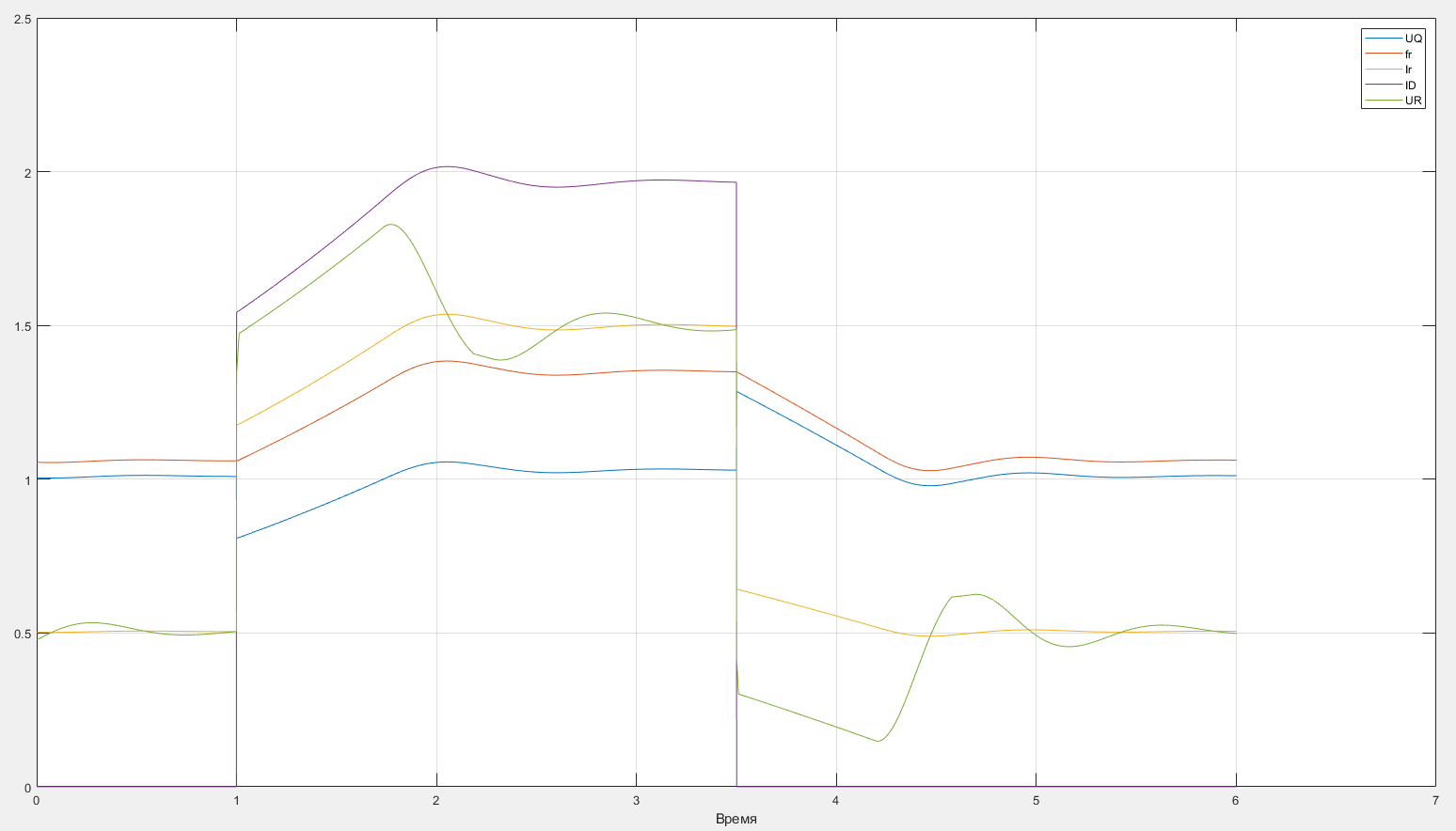 В рамках работы была успешно разработана расчётная математическая модель СГ для исследования переходных процессов при включении и отключении статической активно-индуктивной нагрузки. Полученный график представлен на Рисунке 2. Он позволяет наглядно продемонстрировать как изменяются различные величины при добавлении некоторой нагрузки или же её отключение. В рамках работы основные вычисление и само построение были выполнены в рамках среды Matlab, были закреплены полученные ранее навыки.