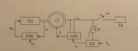 На Рисунке 1 изображен СГА, состоящий из СГ, ПД, выключателя S, нагрузки Z. ПД оснащен регулятором частоты вращения (РЧВ), а СГ – автоматическим регулятором напряжения (АРН). Также присутствуют КН для АРН и СУН.