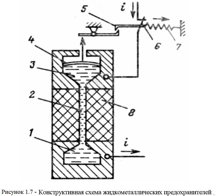 Таким недостатком не обладают жидкометаллические предохранители, которые разрабатываются в последние годы. В изоляционной трубке 8 (рисунке 1.7) канал 2 малого диаметра, заполненный жидким металлом (галлий, сплав Gа - In, Sn и др.) из резервуаров 1 и 3, играет роль плавкой вставки.