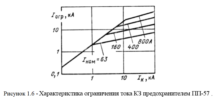 Эти предохранители обладают заметным токоограничивающим действием. Зависимость ограниченного тока Iогр в сети напряжением 660 В от расчетного тока КЗ Iк. при разных номинальных токах плавкой вставки Iном для быстродействующего предохранителя ПП-57 показана на рисунке 1.6. Чем меньше номинальный ток вставки, тем меньше паров металла в дуге, тем больше сопротивление дуги и больше степень ограничения тока в цепи.