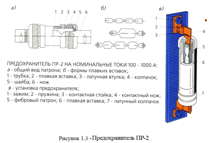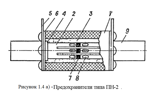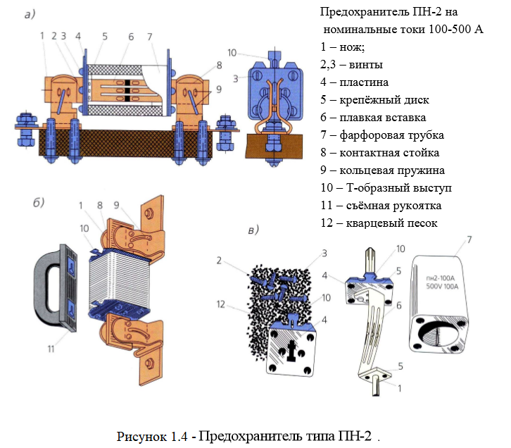 Предохранители насыпные типа ПН-2 (рисунок 1.4 а)- 1.4) широко применяются для защиты силовых цепей до 500 В переменного и 440 В постоянного тока и выполняются на номинальные токи 100-600 А.