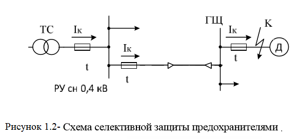 Важно обеспечить селективность работы предохранителей (рисунок 1.2). Если при повреждении в двигателе ток к.з. проходит последовательно через три предохранителя, то быстрее всех должна расплавиться вставка у предохранителя, ближайшего к месту повреждения.