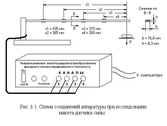 На рис. 3.1. схематически представлена консольная балка с четырьмя тензорезистивными преобразователями (ТП) и четырехканальный аналого-