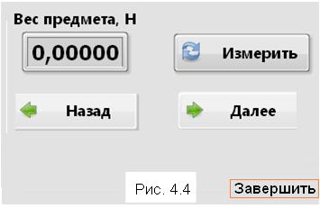 После калибровки преобразователя «сила – напряжение» выполняется п. 2 Программы работы. После нажатия в предыдущем пункте кнопки «Далее» на экране появляется окно с кнопкой «Измерить».