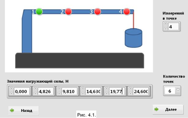 На эскизе балки обозначены места расположения двойных датчиков 1, 2, 3, 4, номера которых соответствуют номерам измерительных каналов. Кроме того на этом же экране представлена таблица, в которую следует вписать значения силы нагружения балки (в Ньютонах) последовательно,