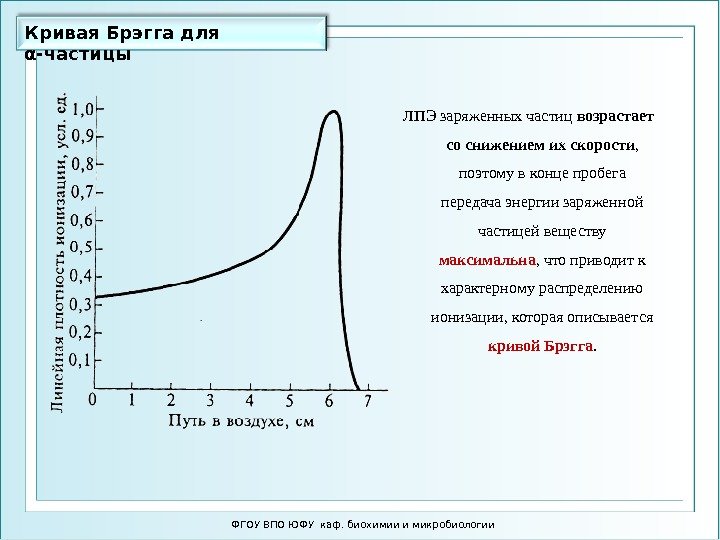 При прохождении через вещество любая заряженная частица теряет кинетическую энергию на ионизацию и возбуждение атомов вещества. Эти потери и определяют пробег частицы. Зависимость удельной ионизации (это процесс образования положительно или отрицательно заряженных ионов или свободных электронов) (то есть числа электронов в 1 см3), производимой частицей от расстояния х, пройденного этой частицей, называется кривой Брегга. Экспериментально установлено, что независимо от энергии частицы она теряет в каждом акте ионизации около 35 эВ, поэтому, зная энергию α-частицы, можно примерно вычислить после скольких актов ионизации она полностью затормозится. Вероятность ионизации атомов среды при энергиях α-частиц в несколько МэВ примерно 103 раз больше вероятности ядерного взаимодействия. Поэтому путь большинства α-частиц в среде прямолинеен (отклоняются только частицы, «столкнувшиеся» с ядром).