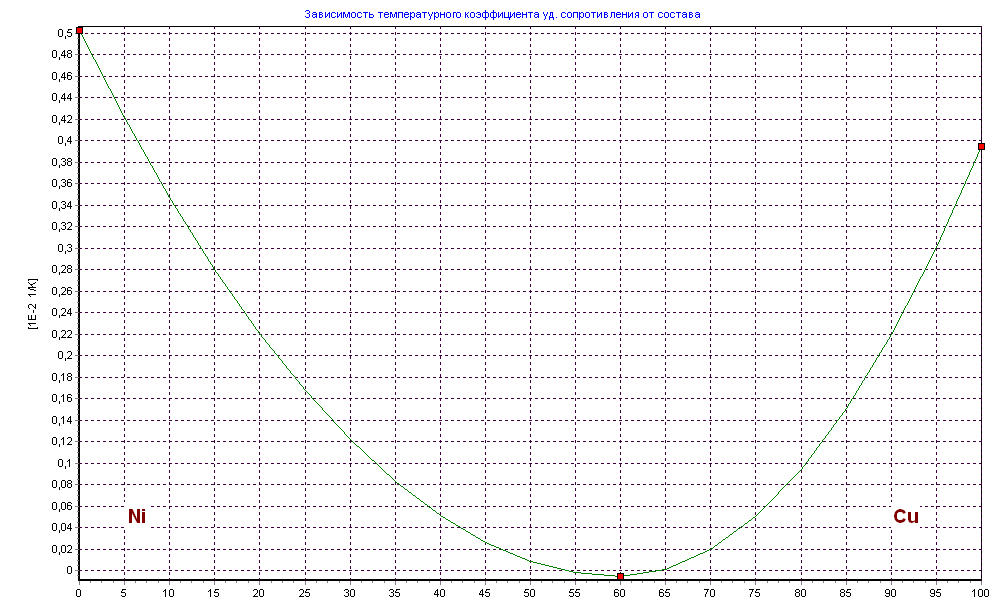 Изучив график и таблицу зависимости температурного коэффициента удельного сопротивления от состава, увидеть, что сплав имеет значение температурного коэффициента удельного сопротивления равное нулю при количестве меди 60%. При увеличении содержания меди выше 60% температурный коэффициент постепенно увеличивается до 0.4. При увеличении содержания никеля выше 60% удельное сопротивление постепенно увеличивается до 0.5 .
