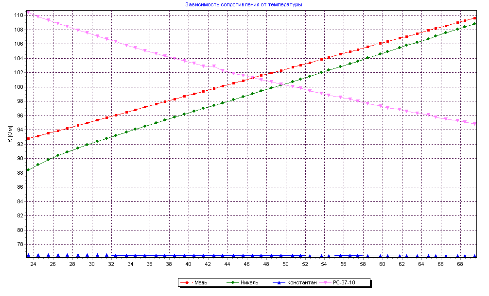 Константан на протяжении всего измерения показывал постоянство коэффициента удельного сопротивления при изменении температуры. Сопротивление также оставалось постоянным.