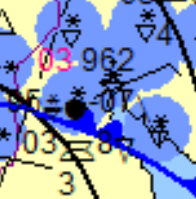 Вывод: В исследуемой точке в нижнем ярусе наблюдаются кучево-дождевые облака. В этих облаках наблюдается сильная болтанка, сильное обледенение выше нулевой изотермы, гроза, град. Под облаками ливневые осадки. Полеты запрещены в такой облачности.
