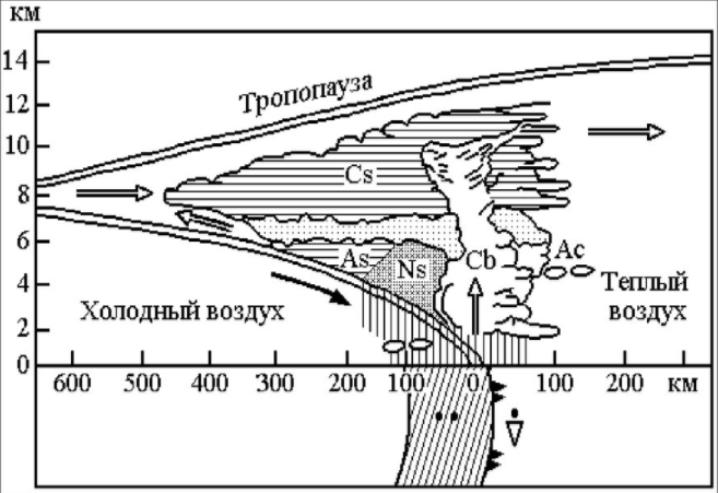 Определим облачность, характерную для данного холодного фронта; положение уровня замерзания в теплом и холодном воздухе по обе стороны линии фронта.