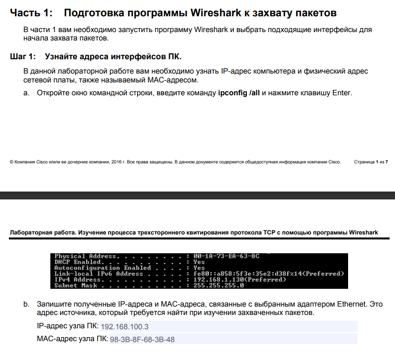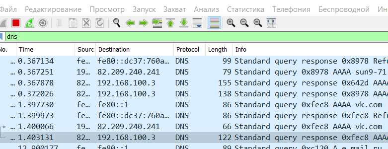 Сначала нужно было написать данные своего компьютера. Это мы узнали в разделе “Сведения о системе ” на ПК. Далее нужно было запустить программу WireSark и назвать IP-адрес DNS-сервера, запрошенного компьютером. Как было указано выше этот адрес равен 192.168.100.3
