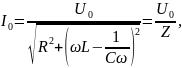 то получим, что амплитудное значение тока I0 определяется амплитудой напряжения U0 и так называемым полным сопротивлением цепи или импедансом Z:
