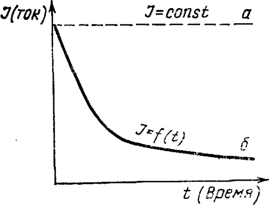 При пропускании постоянного тока через живые ткани было установлено, что сила тока не остается постоянной во времени, хотя прикладываемое напряжение не изменяется. Сразу после подключения источника напряжения сила тока начинает непрерывно падать и устанавливается на уровне много ниже исходного (рис. 5.10).