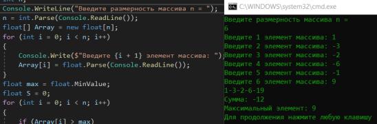 Console.WriteLine("\nСумма: {0}", S); Console.WriteLine("Максимальный элемент: {0} ", max);