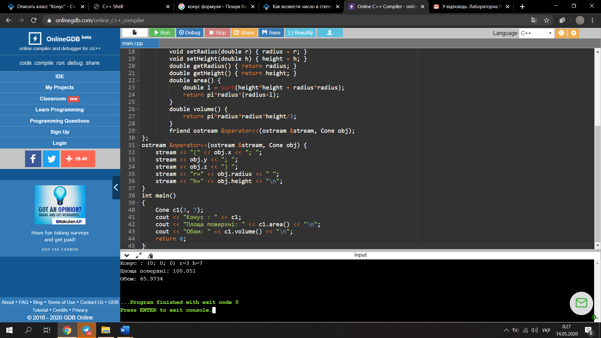 Створити клас – конус. У закритій частині описати поля – радіус основи та висоту. Визначити конструктор, деструктор, зміни значень полів і отримання їхніх значень, виведення полів класу, обчислення об’єму та площі поверхні конуса. Функції зміни значень полів класу повинні перевіряти коректність параметрів, що задаються.