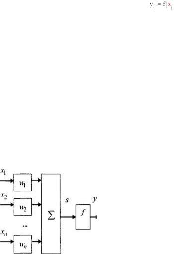 де S – результат підсумовування (sum); щ(i) – вага (weight) синапсу, i=1,n; x – компонент вхідного вектора (вхідний сигнал), i=1,n; b – значення зсуву (bias); n – число входів нейрона; у – вихідний сигнал нейрона; f – нелінійне перетворення (функція активації).