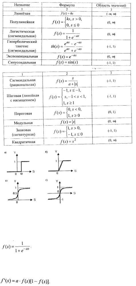 При зменшенні а сигмоид стає пологішим, в межі при а=0 вироджуючись в горизонтальну лінію на рівні 0,5, при збільшенні а сигмоид наближається до виду одиничного стрибка з порогом і. Очевидно, що вихідне значення нейрона лежить в діапазоні(0,1). Одна з цінних властивостей сигмоїдальної функції – простий вираз її похідній: