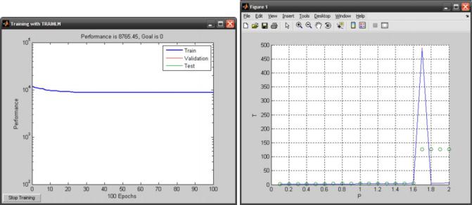 net.trainParam.epochs = 100; %задання числа епох навчання net=train(net,P,T); %навчання мережі