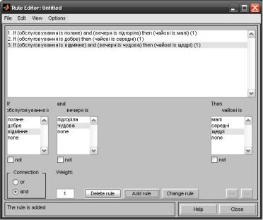 Рис.7.вид редактора правил нечіткого виведення після їх визначення
