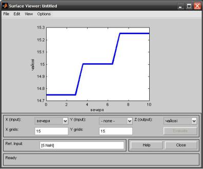 Ця програма служить для загального аналізу адекватності нечіткої моделі, дозволяючи оцінити вплив зміни значень вхідних нечітких змінних на значення однієї з вихідних нечітких змінних. У разі потреби можна отримати графік залежності вихідної змінної від однієї з вхідних змінних. Для цього необхідно вибрати потрібну змінну в списку, що розкривається, X (input), а в спискуY (input), що розкривається, вибрати значення -none-. Отриманий графік залежності зображений на . мал10. Отриманий графік залежності відповідає середньому значенню другої вхідної змінної("якість вечері") в 5 балів. Це значення може бути змінене користувачем, для чого слід ввести потрібне значення в поле