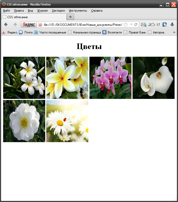 <title>CSS| обтекание</title> <style| type="text/css"> div|.flowers_2 img| {float:right|; margin:26px|; border:1px| solid| #000000|} div|.flowers_2 a:hover| img| {margin:26px|; border:1px| solid| #ffffff|} </style> </head> <body|> <div| class="flowers_2"|> <H1| align="center">Цветы</h1> <а href="#"><img| src=|"../images/flower4.jpg" width="160|" height="160|" border="0|" /> </a> <а href="#"><img| src=|"../images/flower5.jpg" width="160|" height="160|" border="0|" /> </a> <а href="#"><img| src=|"../images/flower.jpg" width="160|" height="160|" border="0|" /> </a> <а href="#"><img| src=|"../images/flower3.jpg" width="160|" height="160|" border="0|" /> </a> <h1| align="center|" style="clear:both">Цветы| </h1> <а href="#"><img| src=|"../images/bee.jpg" width="160|" height="160|" border="0|" /> </a> <а href="#"><img| src=|"../images/bee2.jpg" width="160" height="160" border="0" /> </a> </div> </body> |