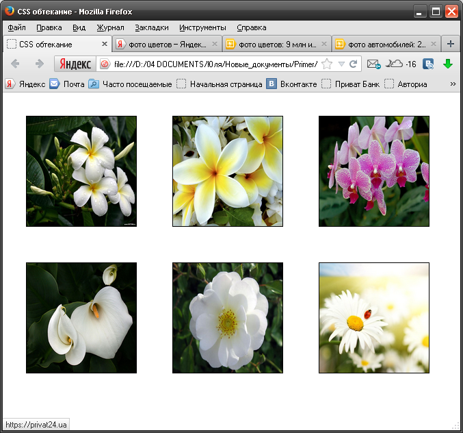 <title>CSS| обтекание</title> <style| type="text/css"> div|.flowers_2 img| {float:right|; margin:26px|; border:1px| solid| #000000|} div|.flowers_2 a:hover| img| {margin:26px|; border:1px| solid| #ffffff|} </style> </head> <body|> <div| class="flowers_2"|> <H1| align="center">Цветы</h1> <а href="#"><img| src=|"../images/flower4.jpg" width="160|" height="160|" border="0|" /> </a> <а href="#"><img| src=|"../images/flower5.jpg" width="160|" height="160|" border="0|" /> </a> <а href="#"><img| src=|"../images/flower.jpg" width="160|" height="160|" border="0|" /> </a> <а href="#"><img| src=|"../images/flower3.jpg" width="160|" height="160|" border="0|" /> </a> <h1| align="center|" style="clear:both">Цветы| </h1> <а href="#"><img| src=|"../images/bee.jpg" width="160|" height="160|" border="0|" /> </a> <а href="#"><img| src=|"../images/bee2.jpg" width="160" height="160" border="0" /> </a> </div> </body> |